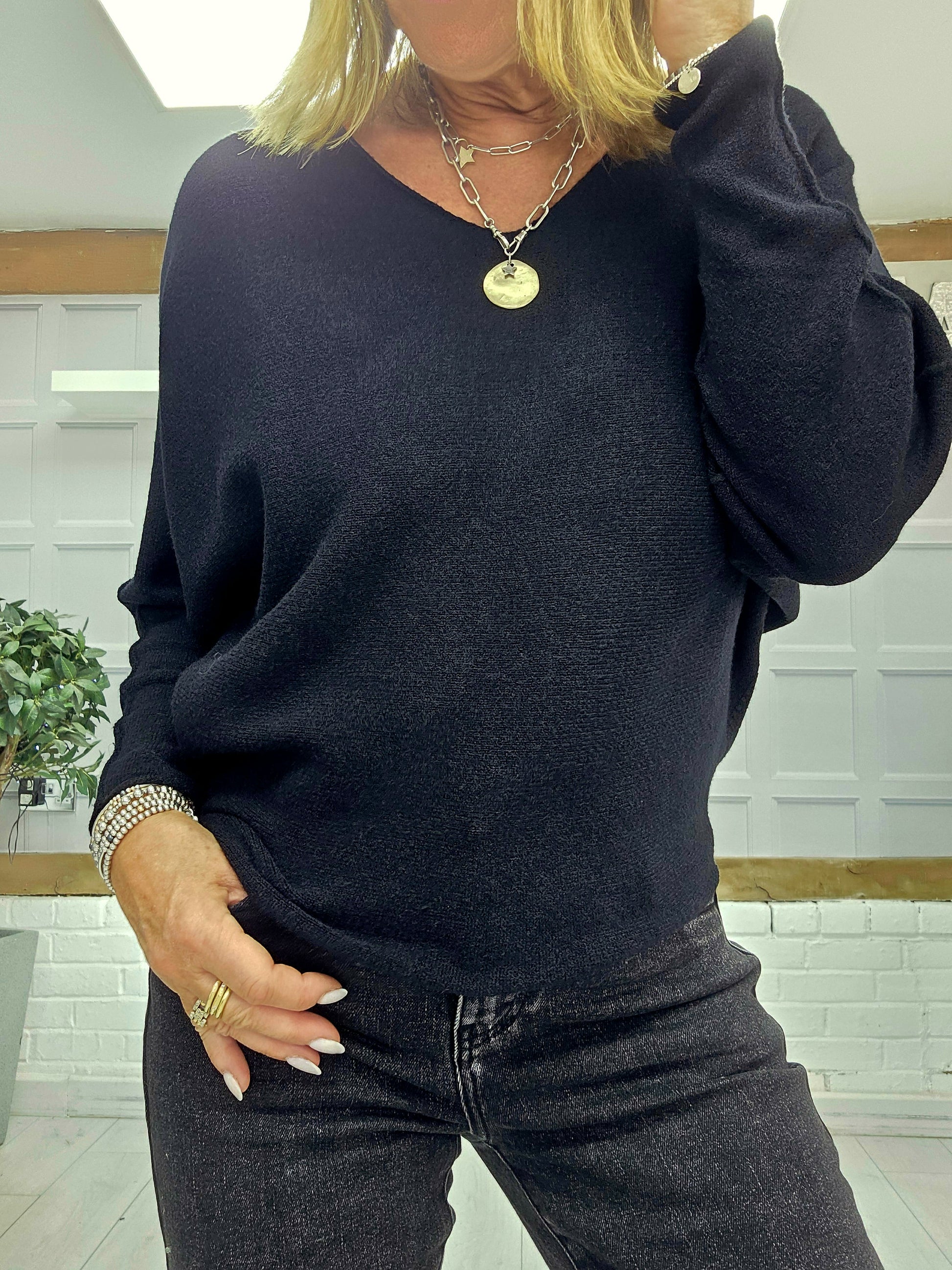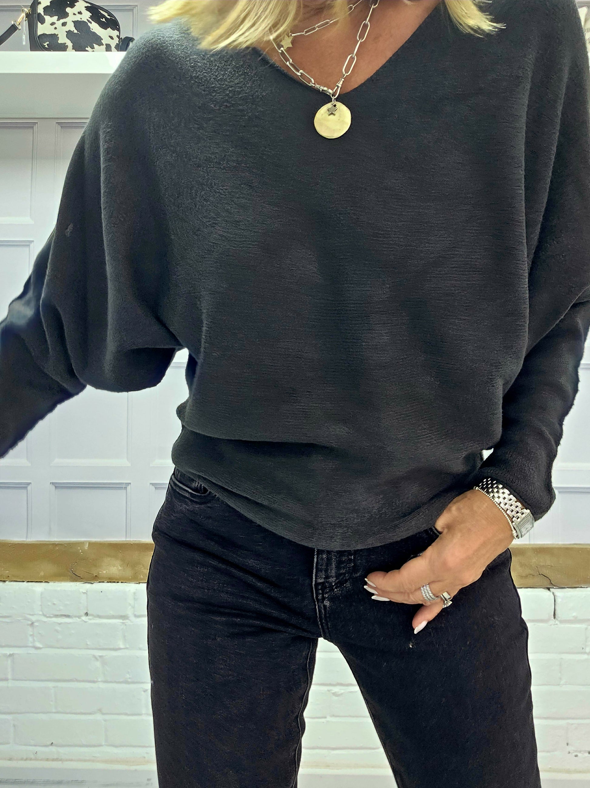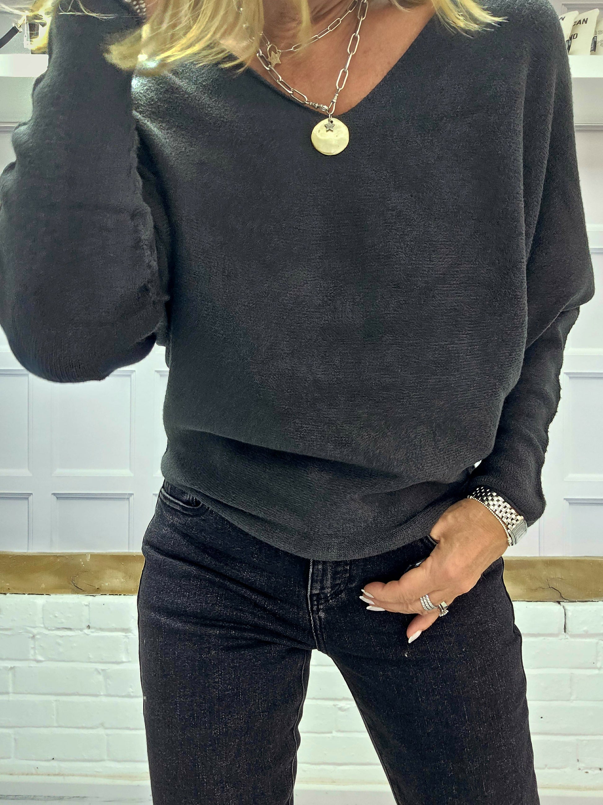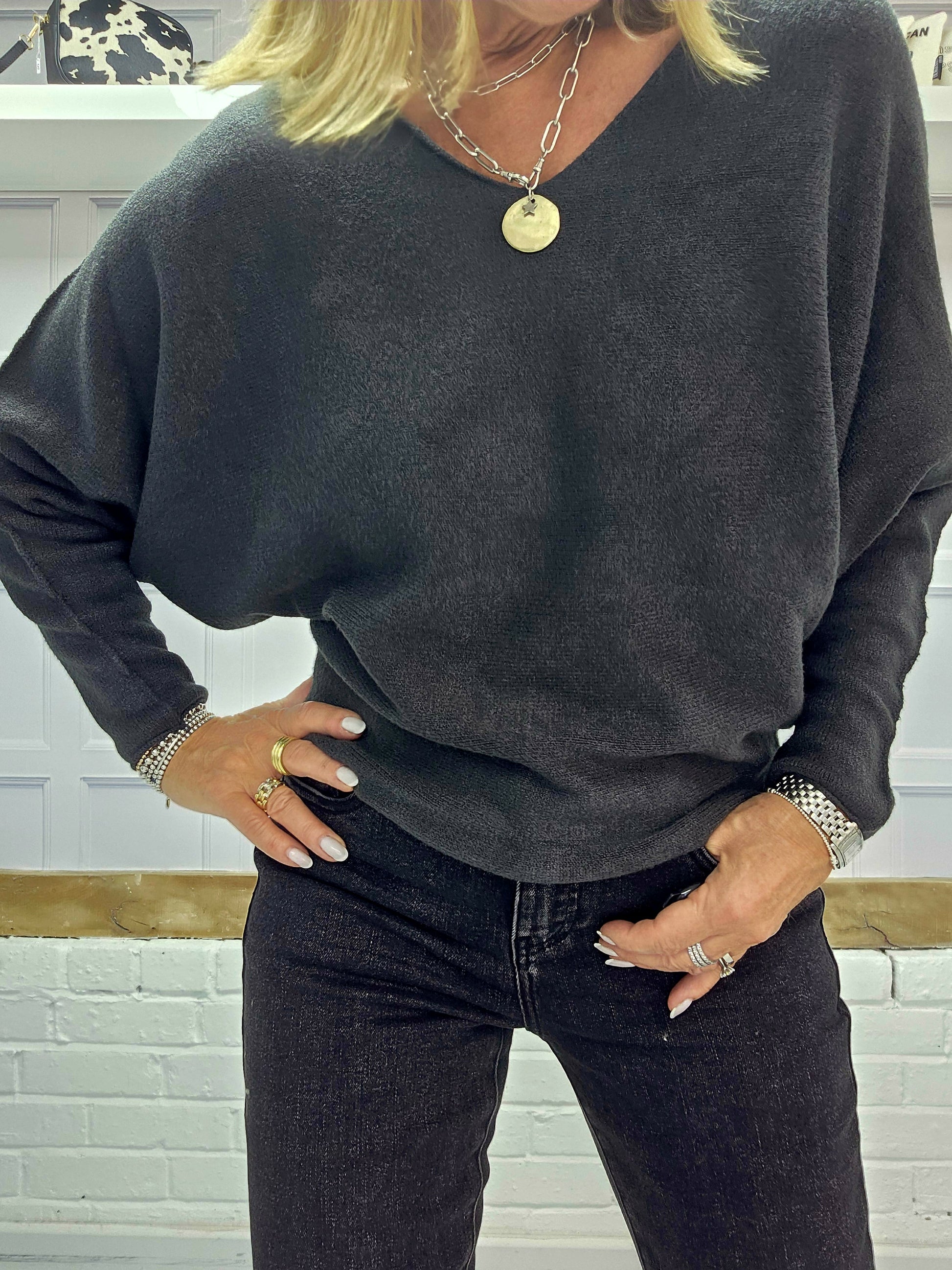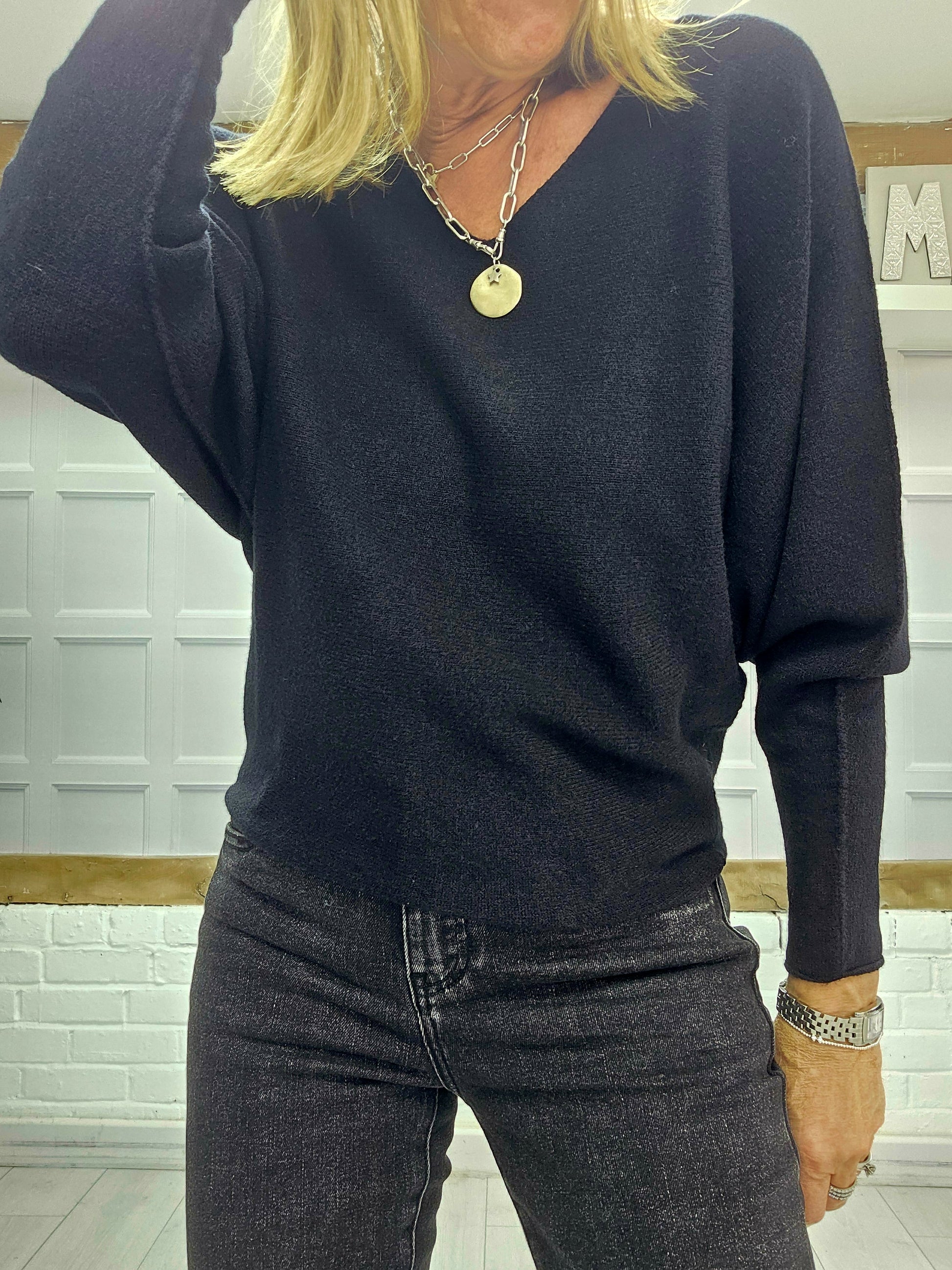 The Cheska jumpers are a super soft knit and are really flattering. They have a slight bat wing sleeve and are slightly shaped. They come in two colour ways Anthracite or Black. They have a gorgeous V neckline and we think this jumper is a perfect staple for any wardrobe.