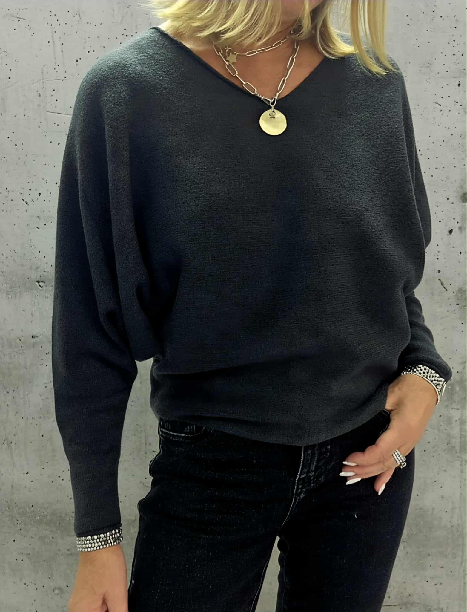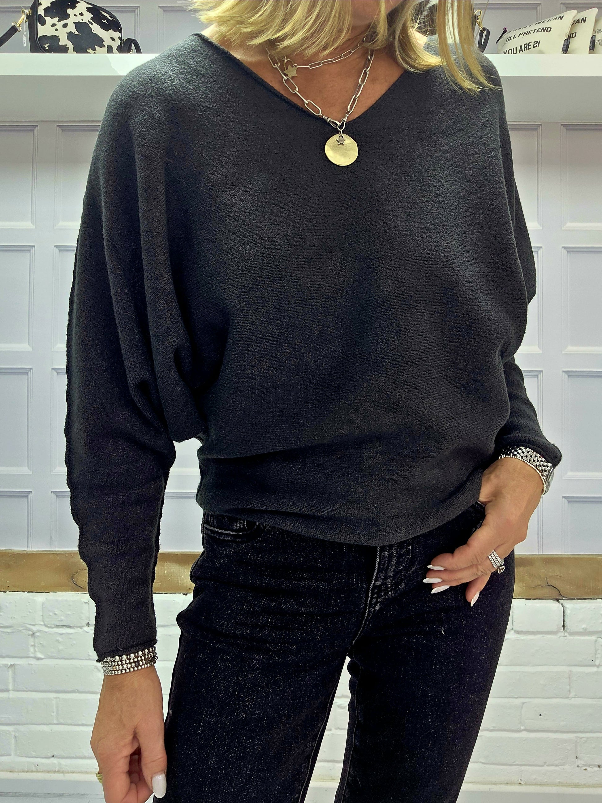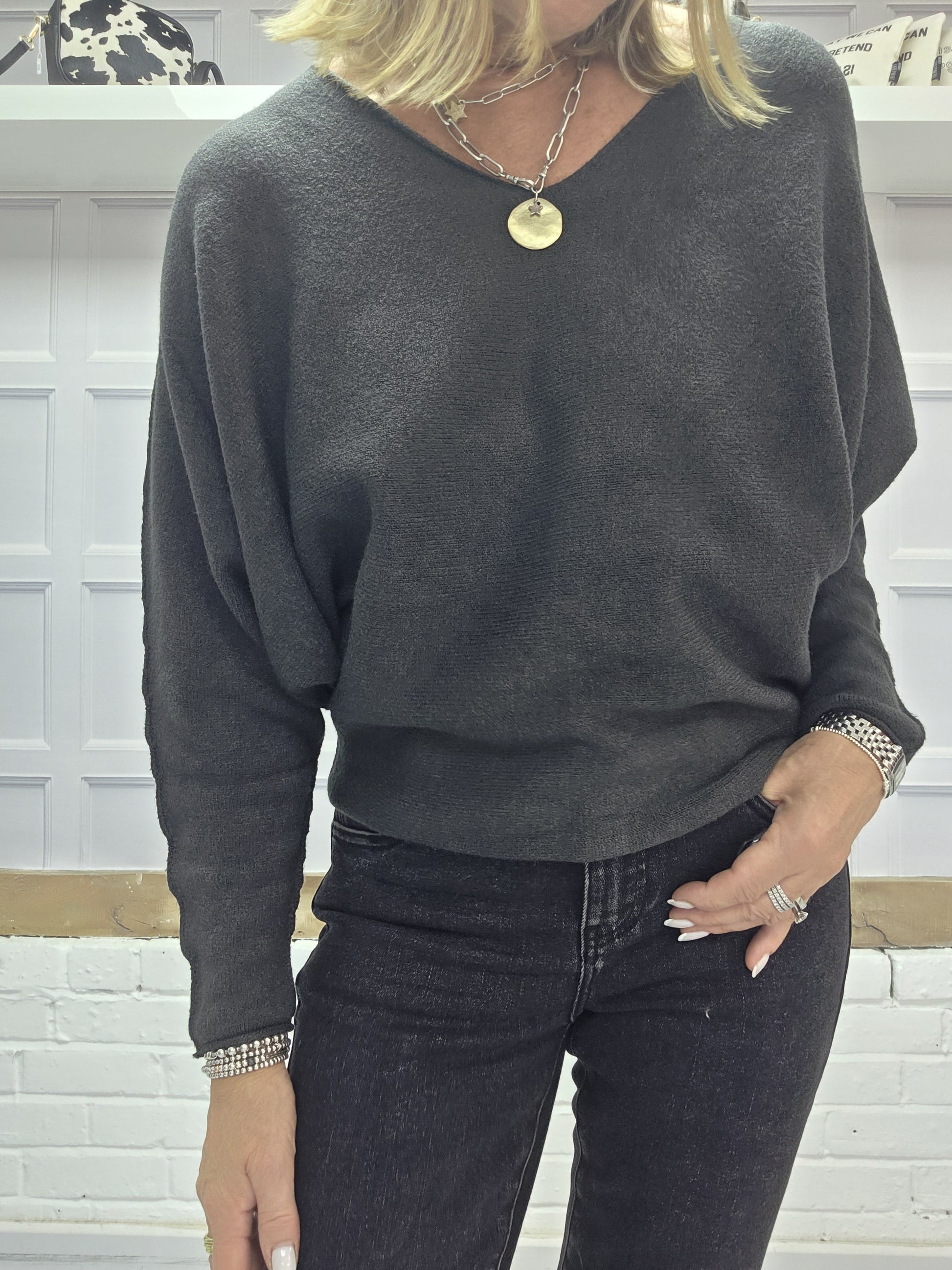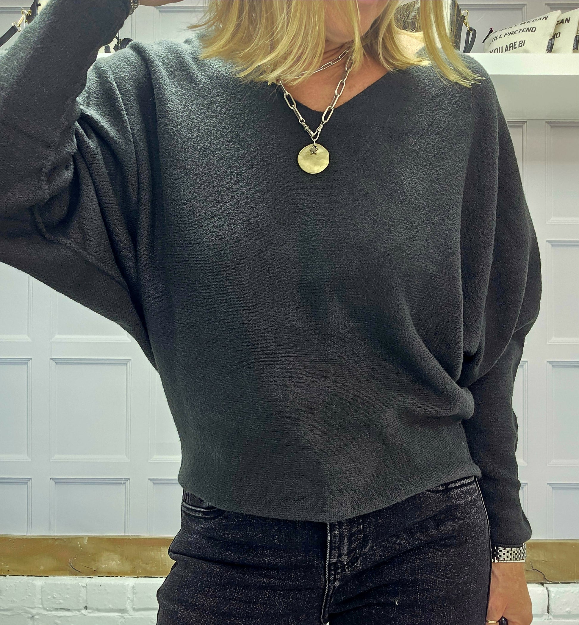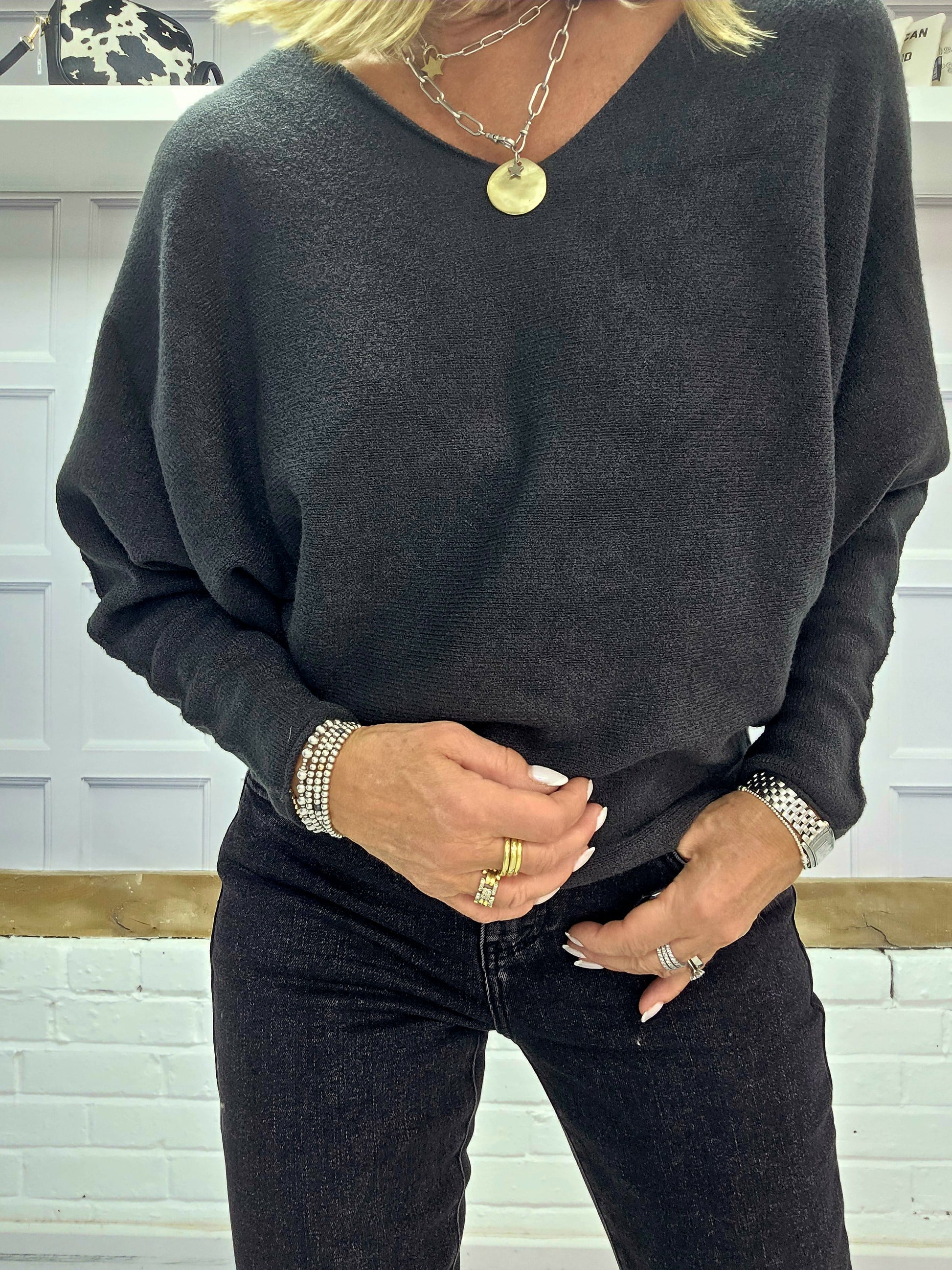 The Cheska jumpers are a super soft knit and are really flattering. They have a slight bat wing sleeve and are slightly shaped. They come in two colour ways Anthracite or Black. They have a gorgeous V neckline and we think this jumper is a perfect staple for any wardrobe.