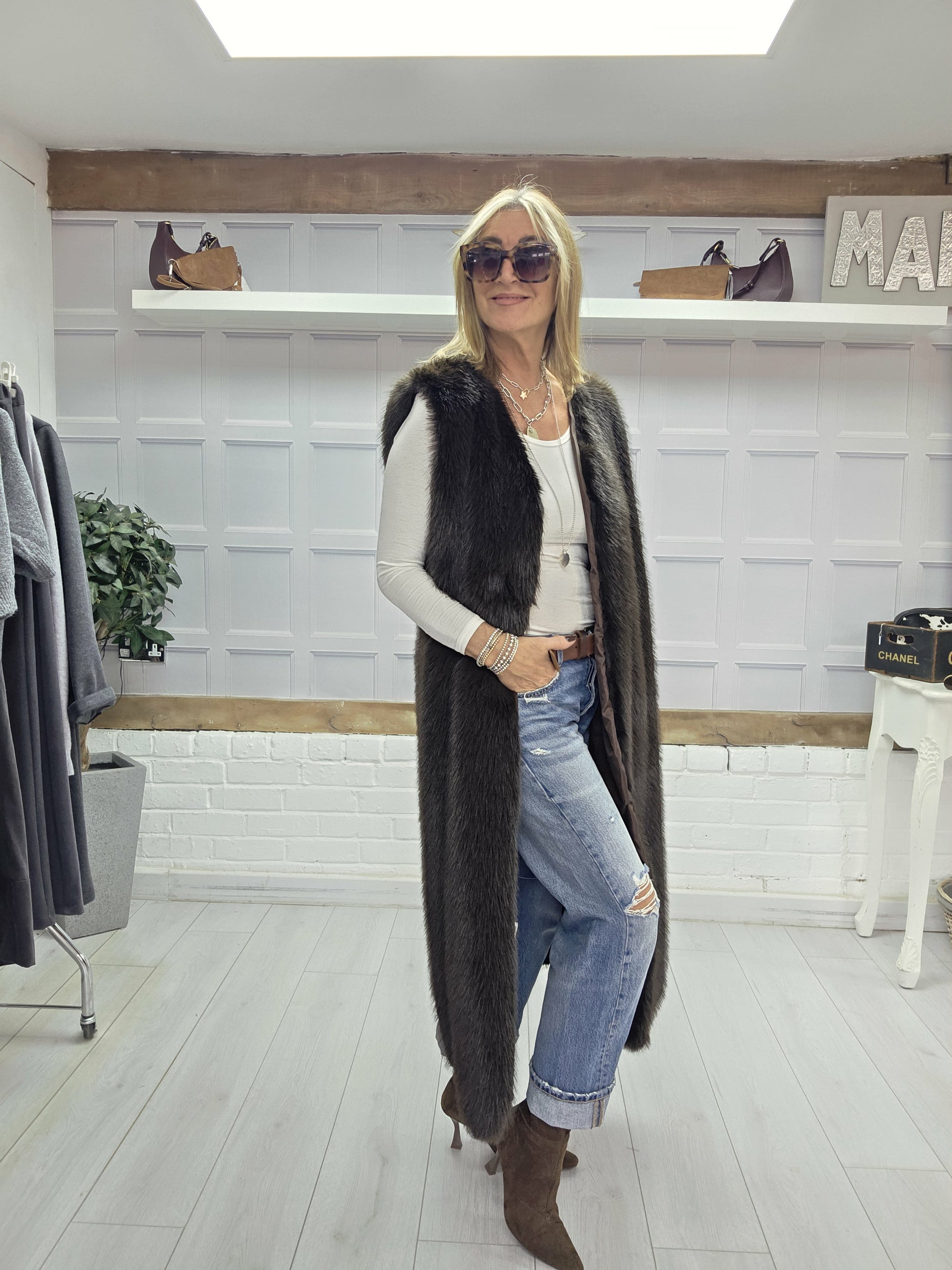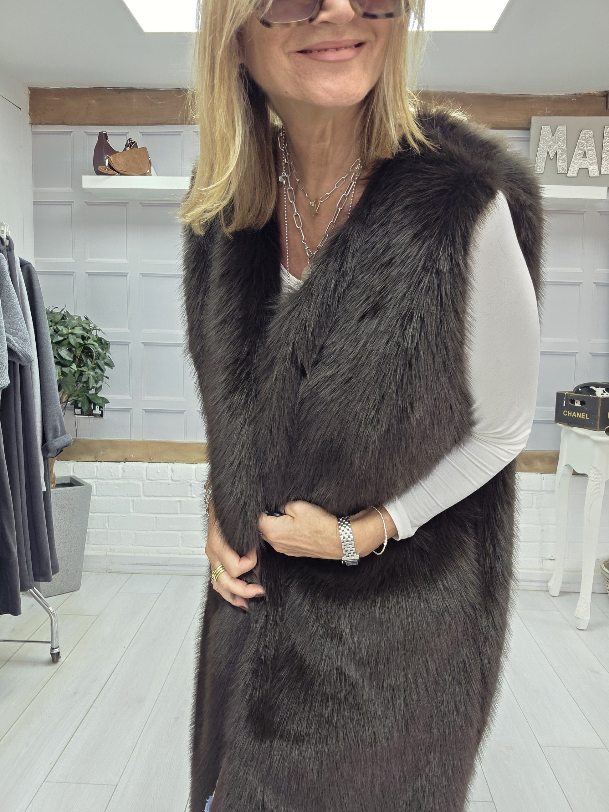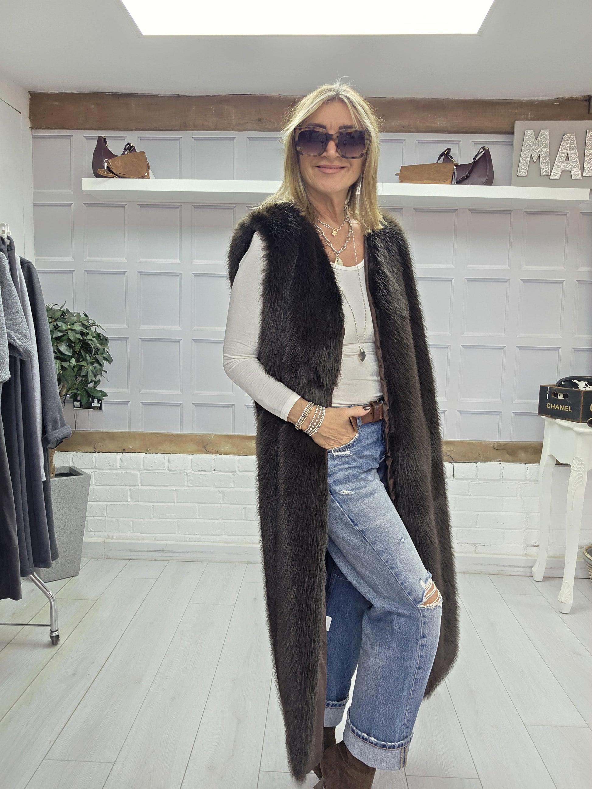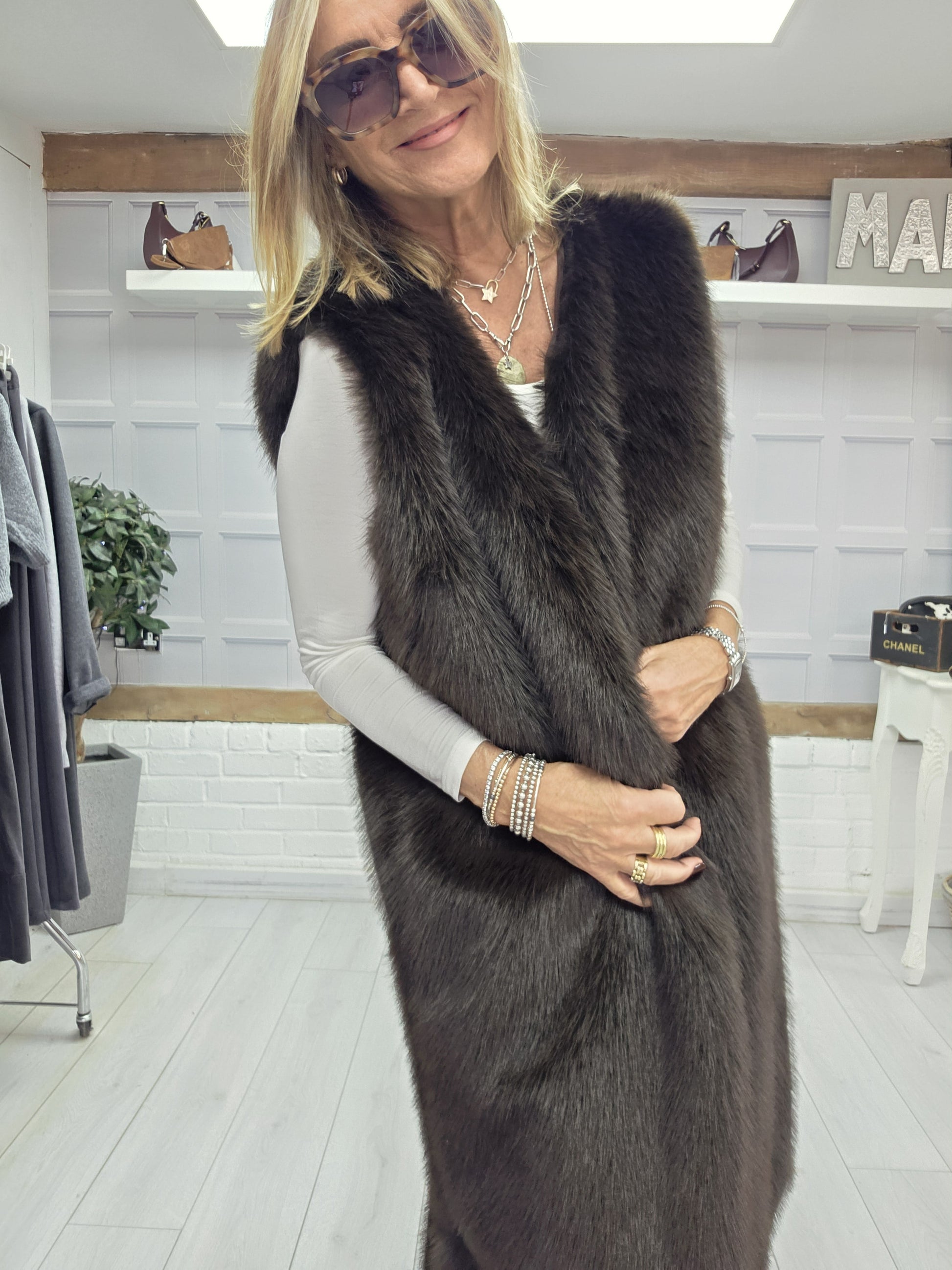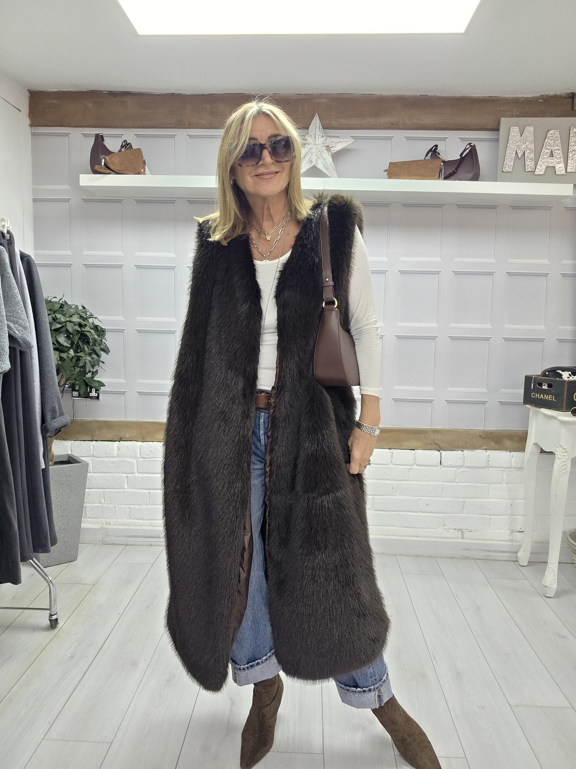 This beautiful faux fur gilet is so impactive, and chic and warm!!! It's truly a gorgeous piece and complements our AW35 collection beautiflly. The gilet is one size, has two deep side pockets and is fully lined. It's a gorgeous rich chocolate brown, so on trrend right now.