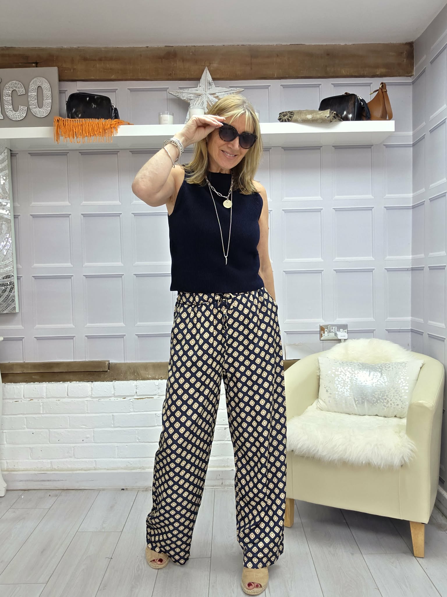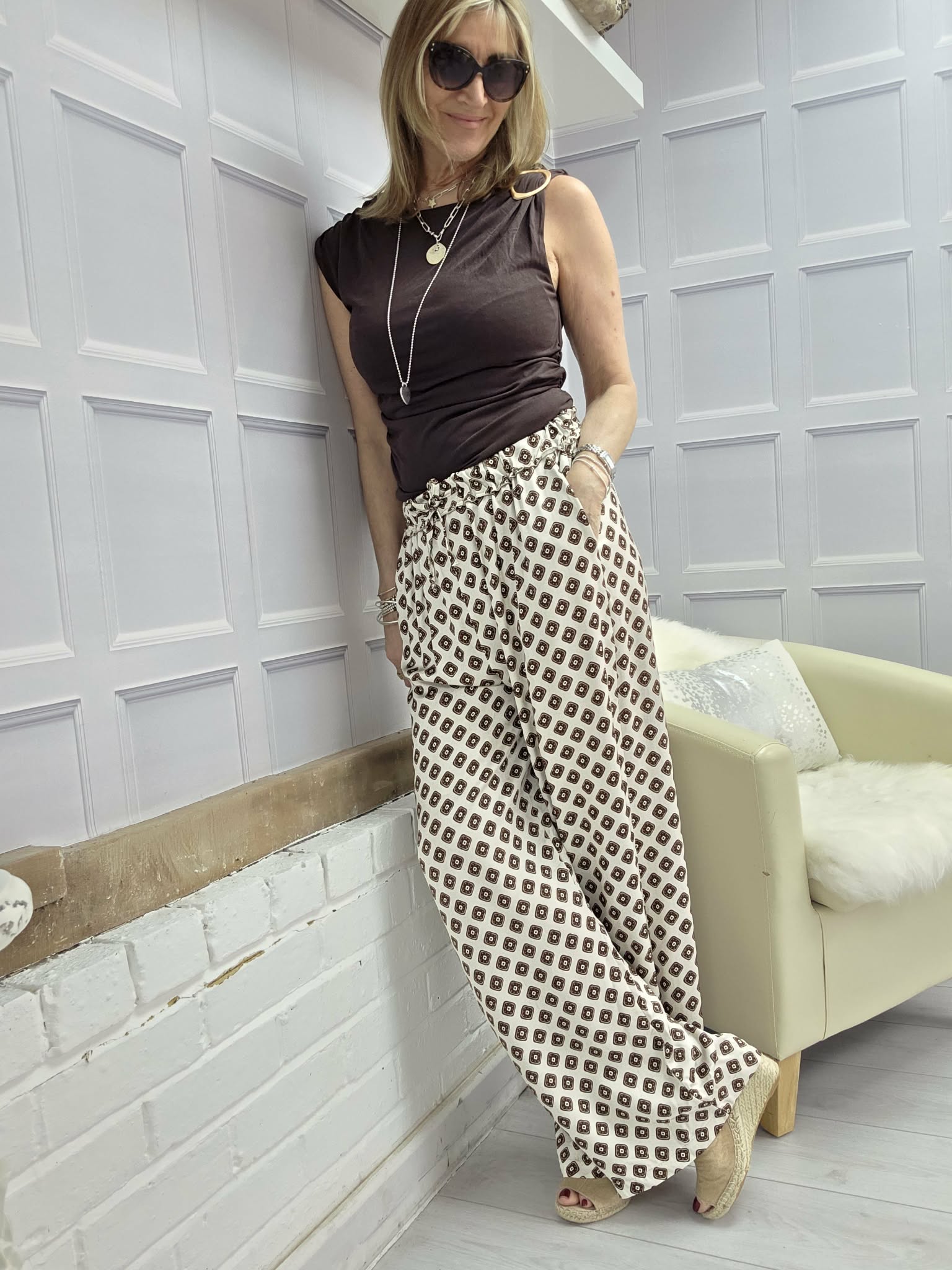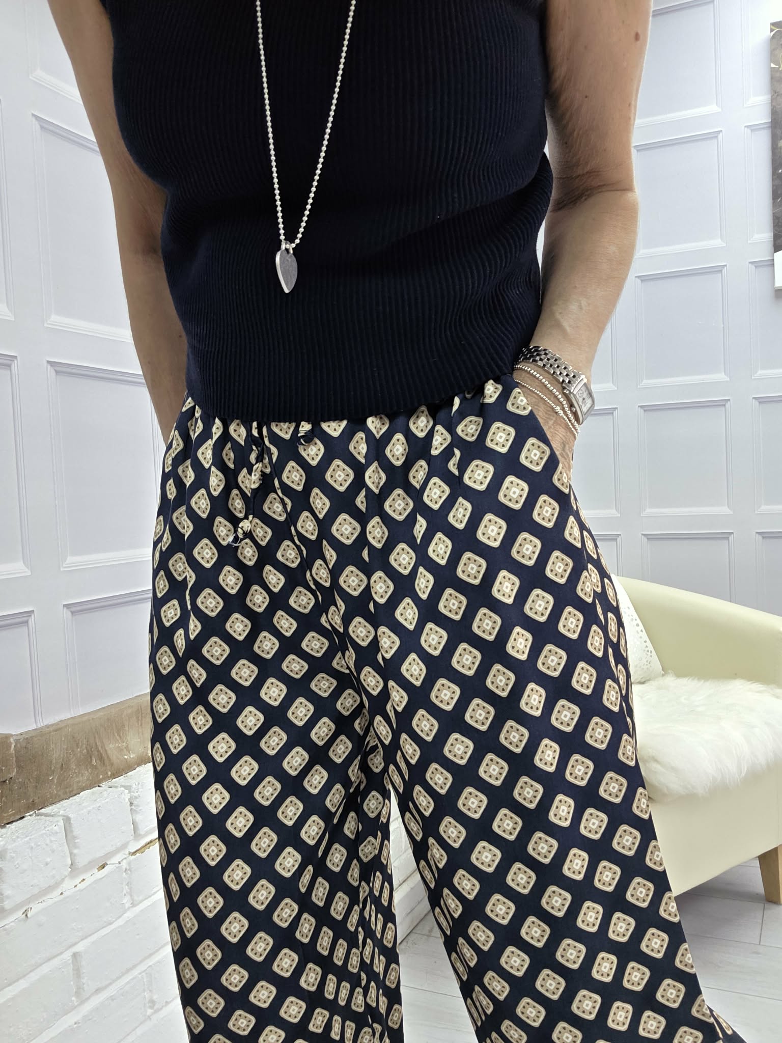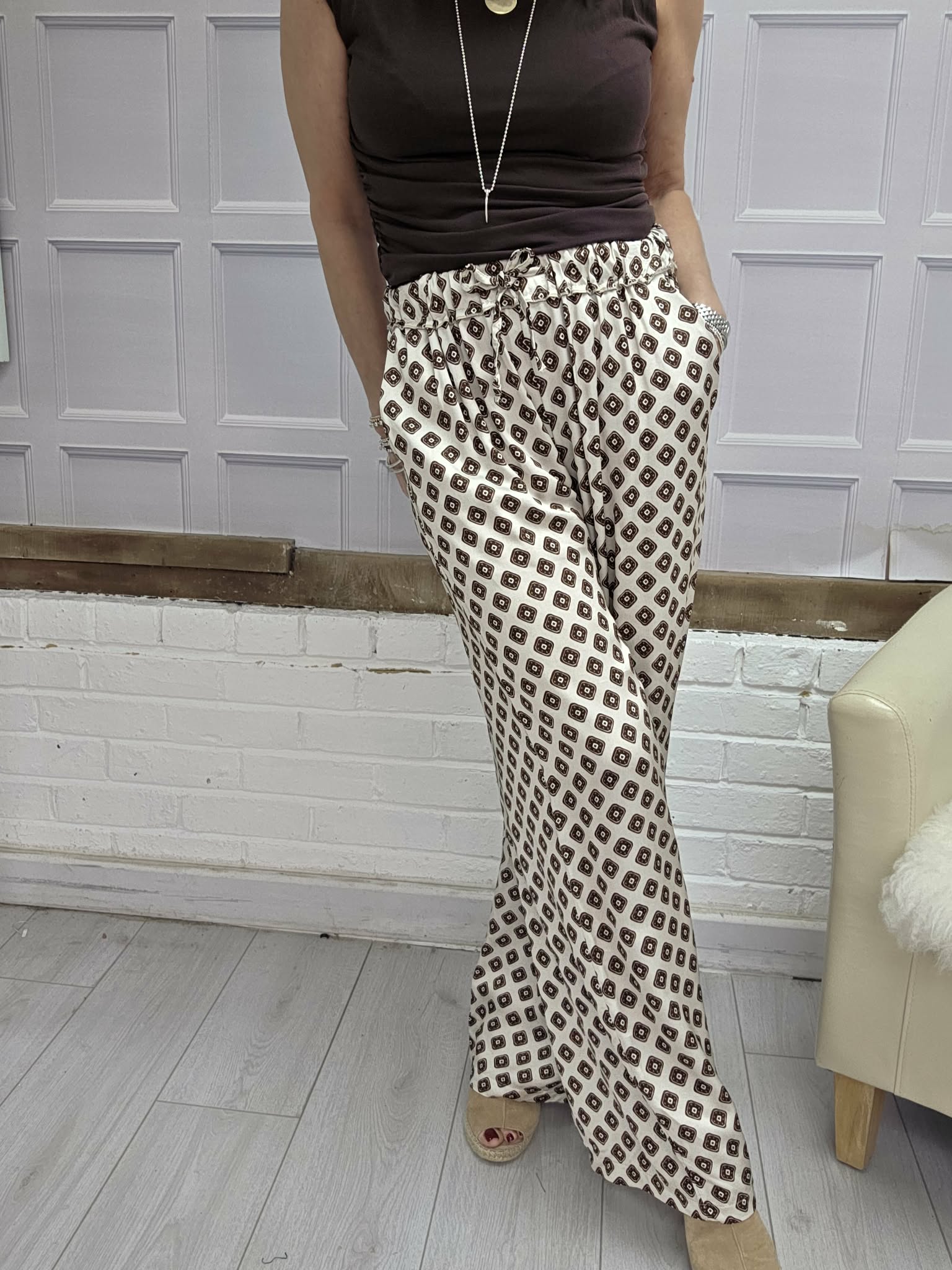 The Leon Trousers are a great staple. Beautifully cut these fit really well. They have a draw string waist, and a wide leg. So easy to wear with either a T shirt, blouse, Denim jacket or as a set with the Leon Dresses. The choices are endless! Trousers are one size.