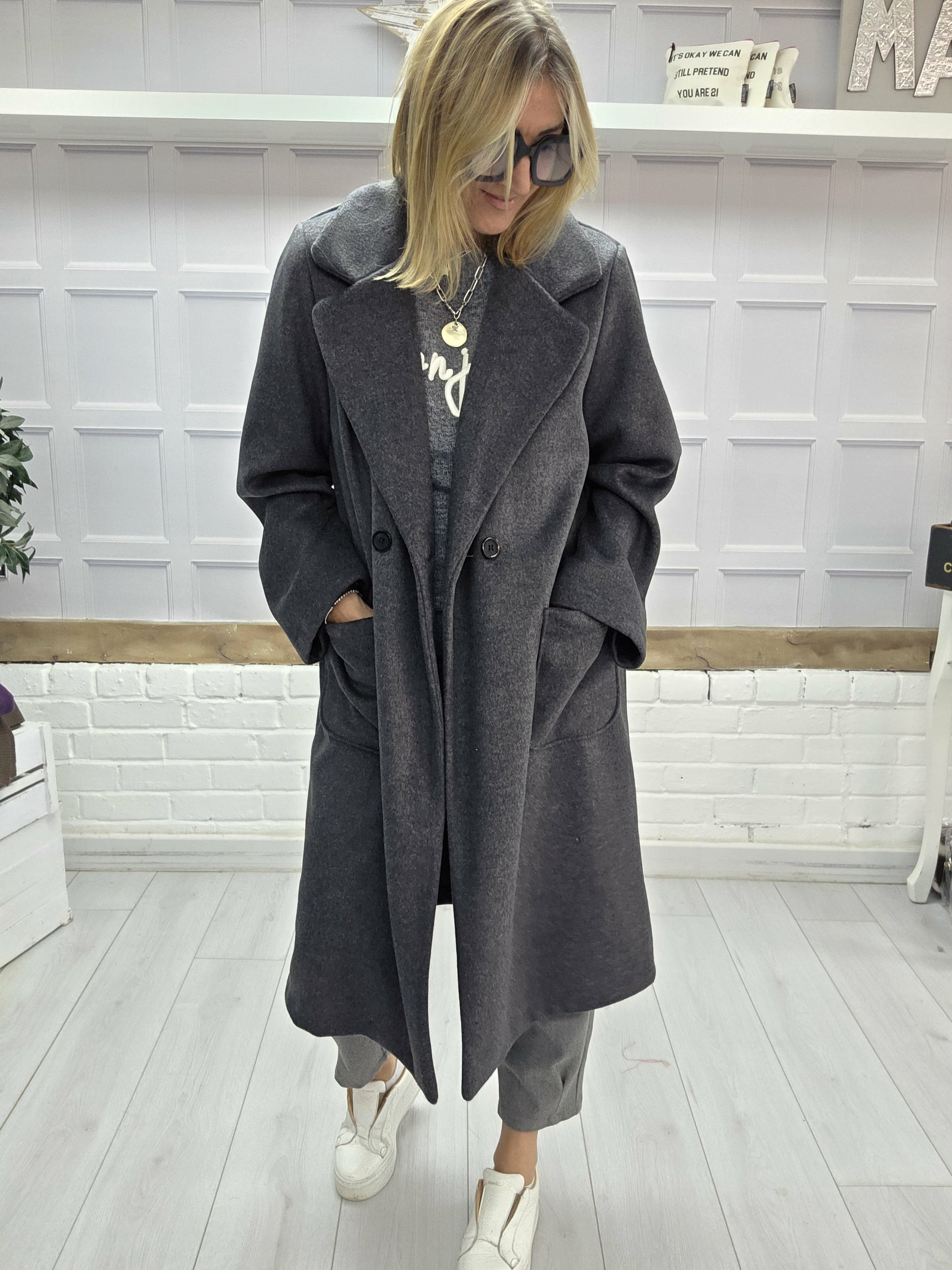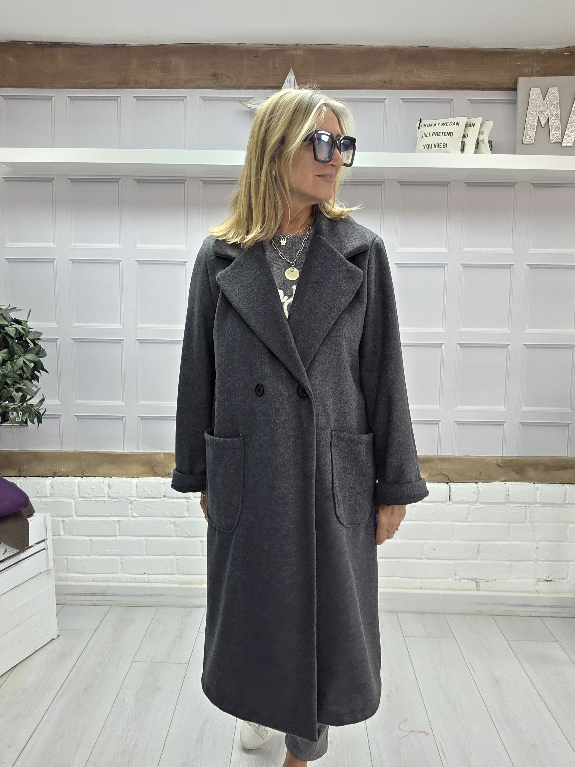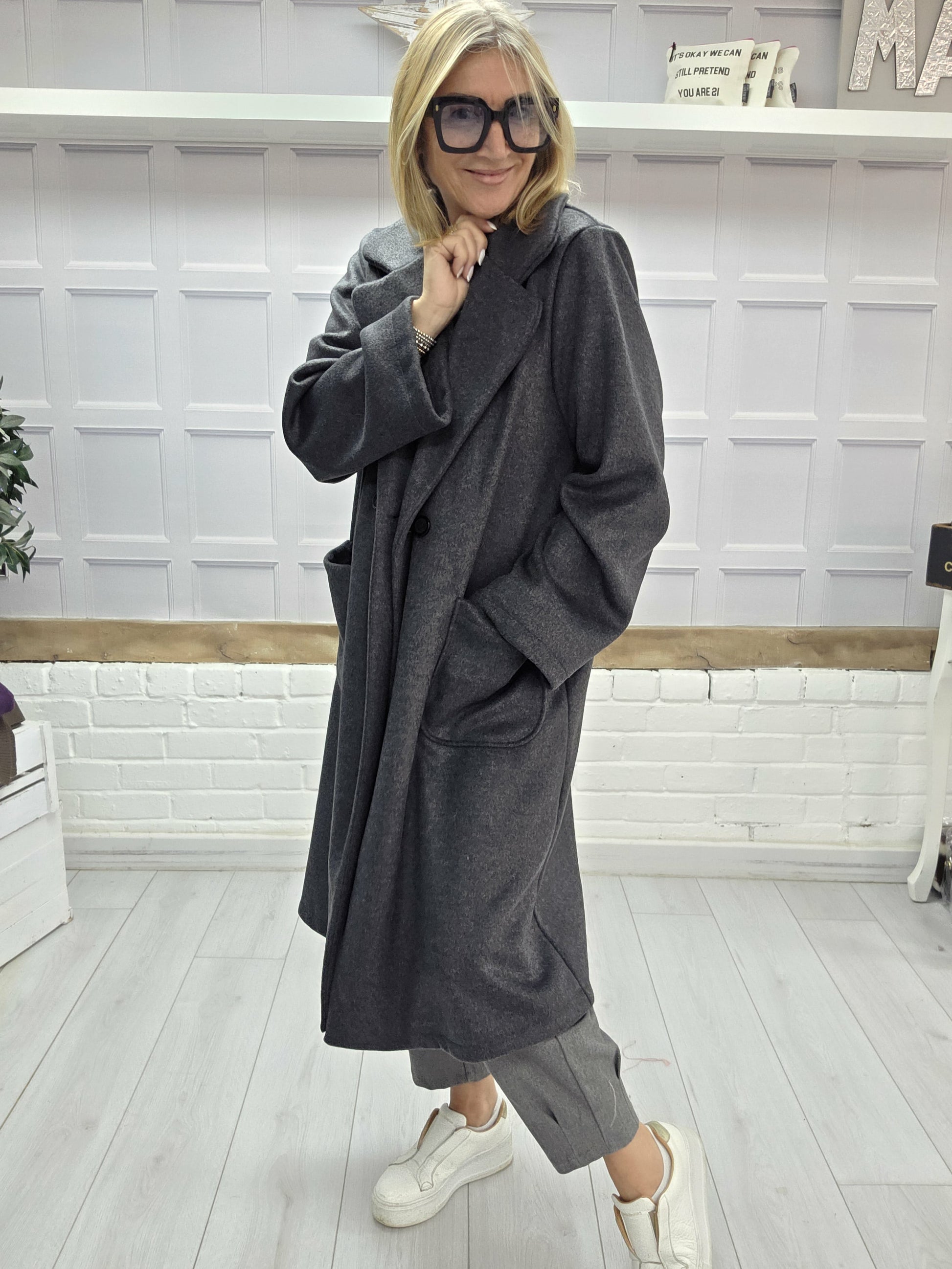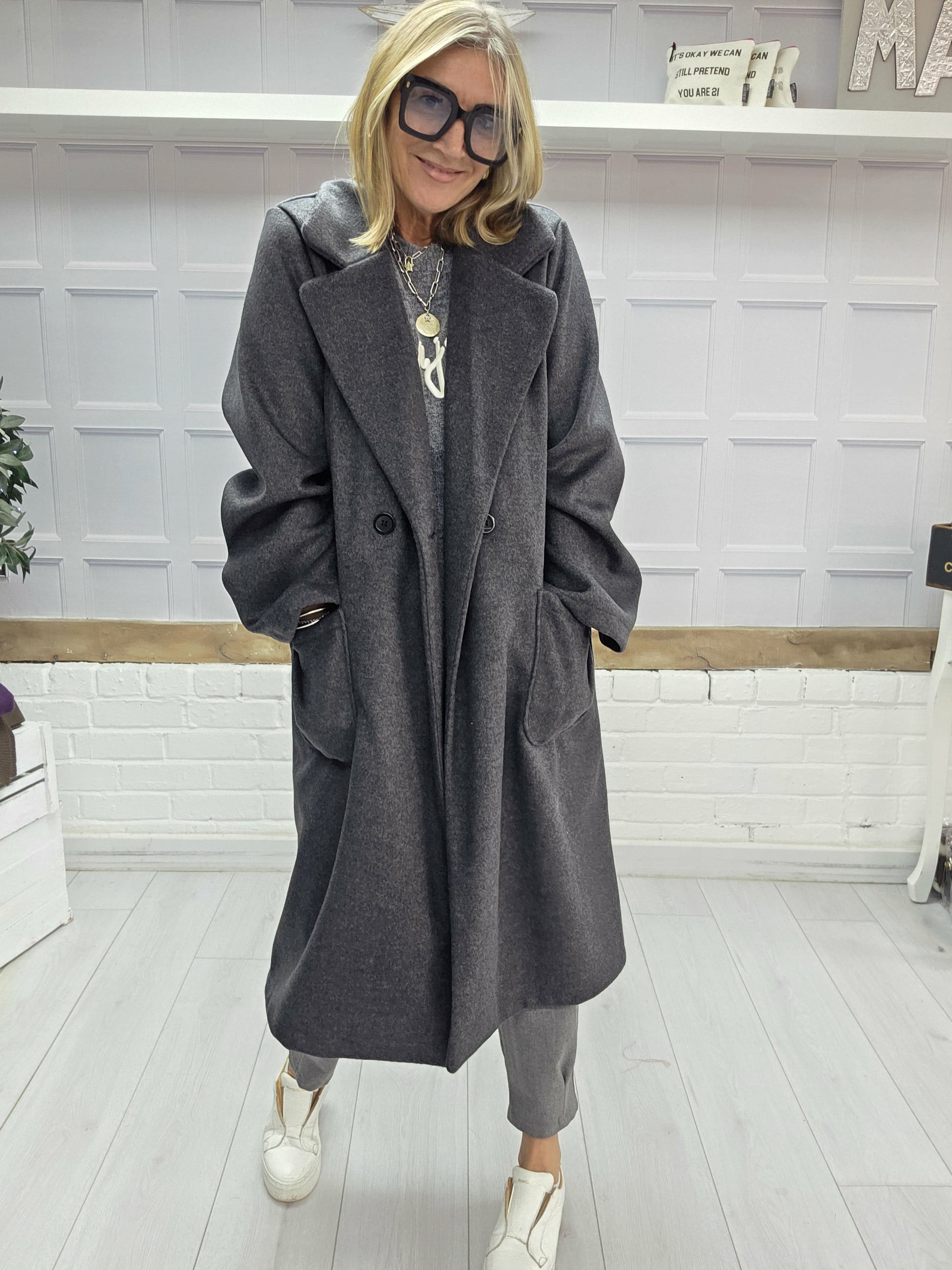The Nova Coat is one of our luxury pieces this season. It's super light weight and is a real statement piece. It has a duster coat feel to it, it's oversized, fitting sizes 8-18. The Nova is super soft and is a beautiful shade of grey, so easily coordinaes with every colour. With two deep pockets, and a button front this coat is a winner this season.