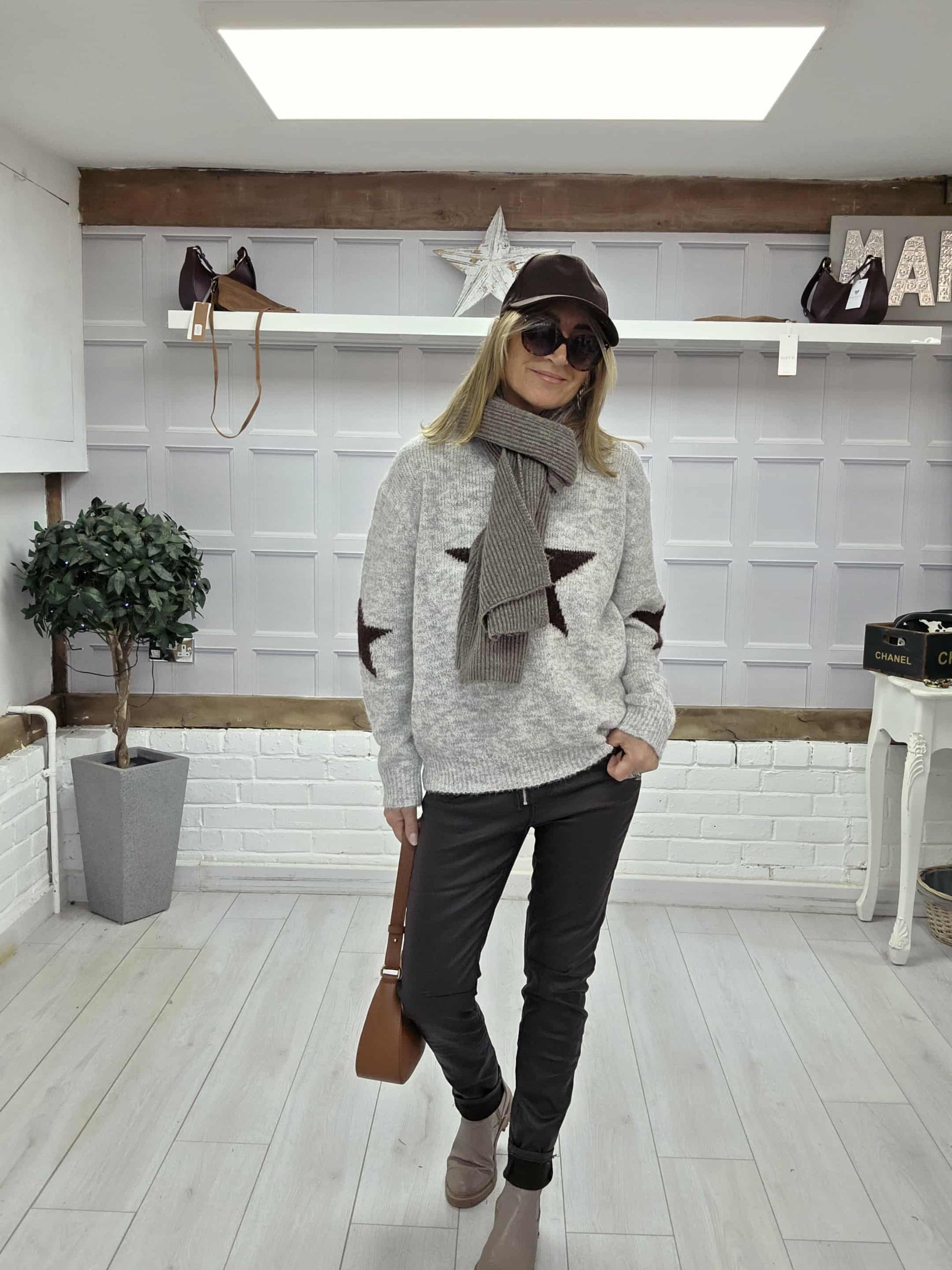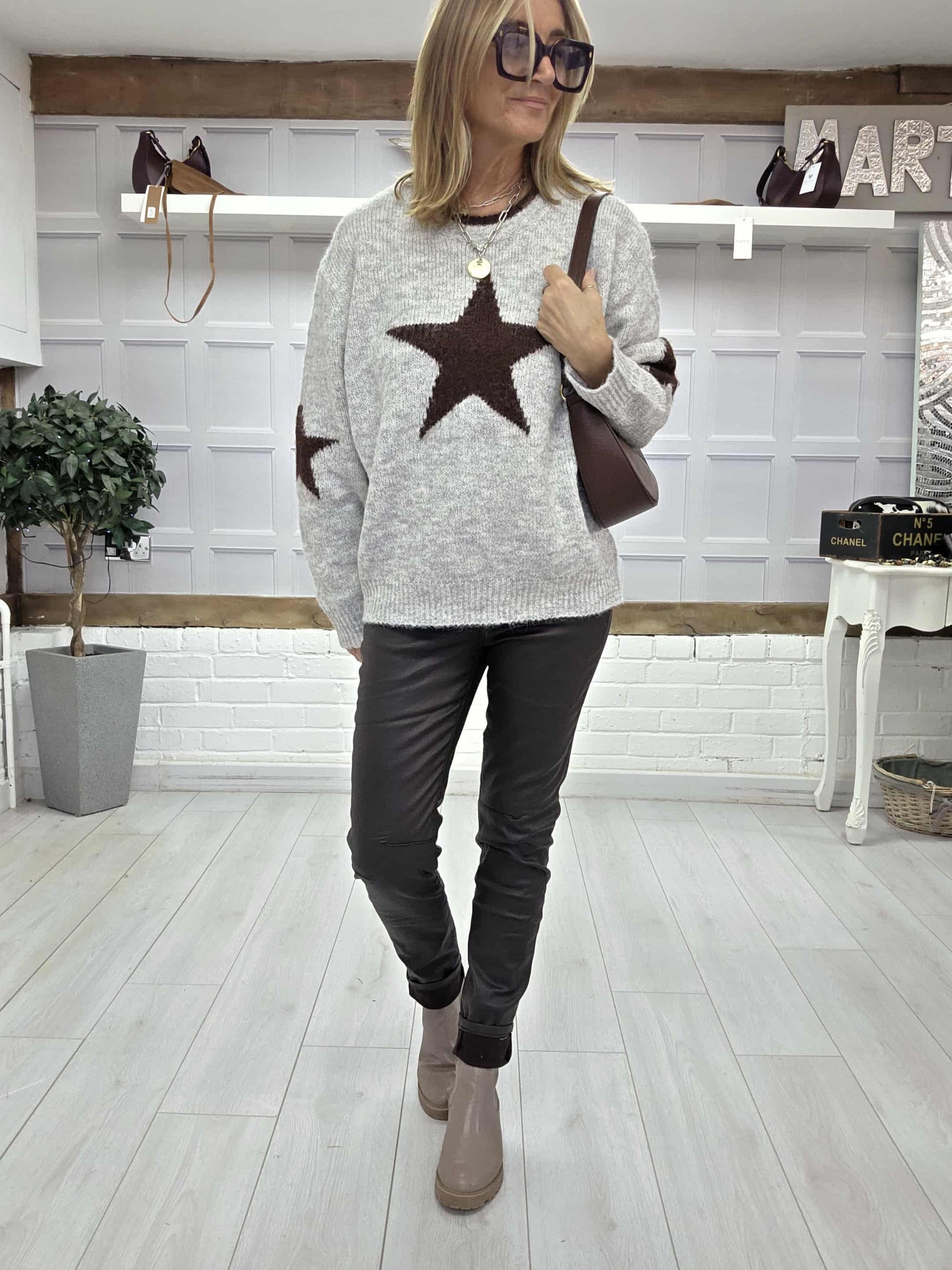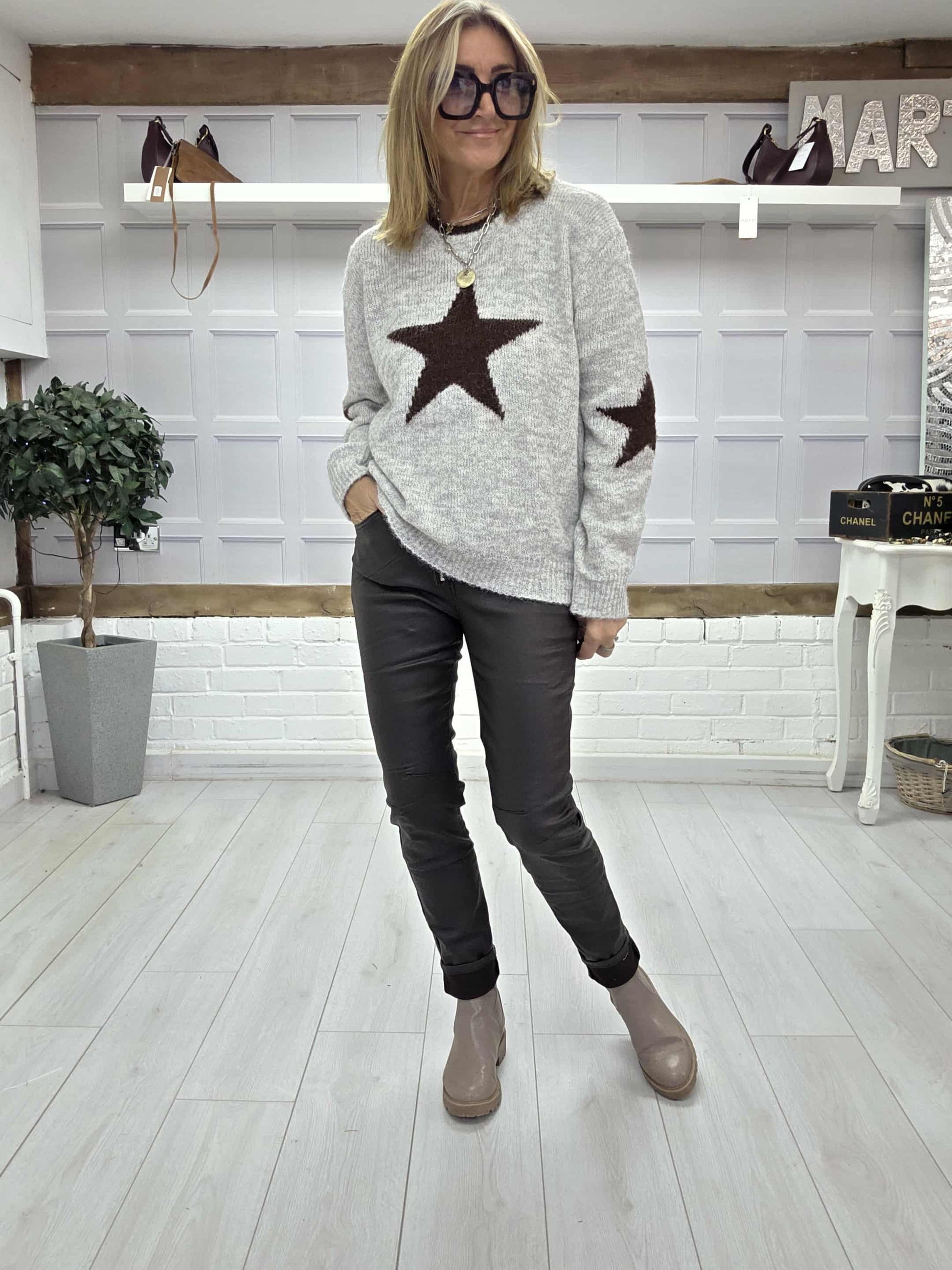The Tamsin jumper is such a good all rounder. It sits really well on our Wax Coated chocolate brown jeans, but will look equally fab over jeans or one of our satin skirts in grey or chocolate!